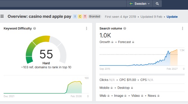 Att Apple Pay blivit vanligare i butik och e-handel syns också i hur svenskar söker information online. En genomgång av sökdata från Ahrefs visar att sökningar på termer som “Apple Pay casino”, “Apple Pay casinon” och “casino med Apple Pay” har ökat stadigt under de senaste åren.